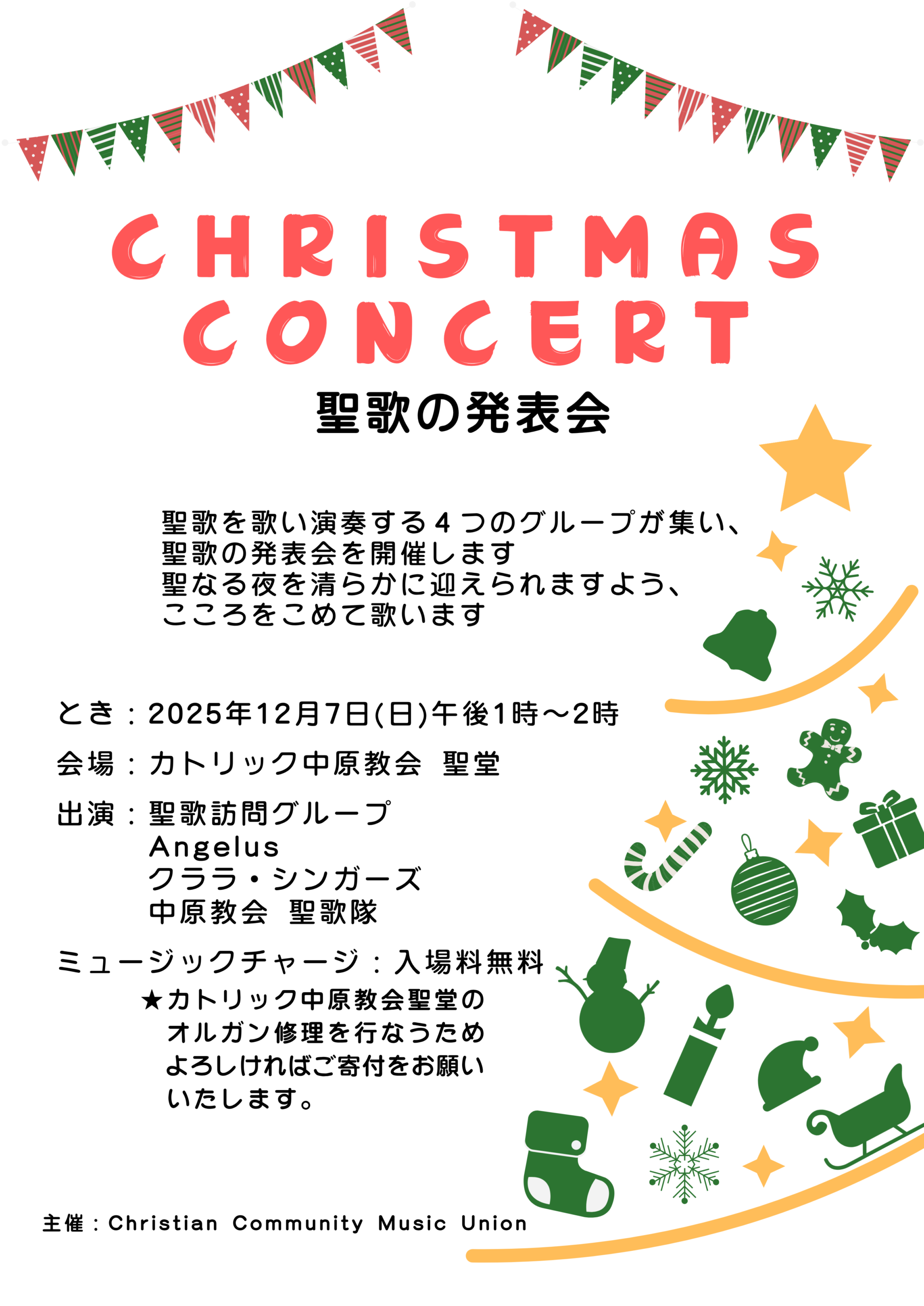 ミサ後13時より聖堂にてクリスマスコンサートを行います。入場無料(寄付は貴重なオルガンの維持のためできましたらご寄付をお願いいたします)。詳細は下記よりポスターをダウンロードしてください。